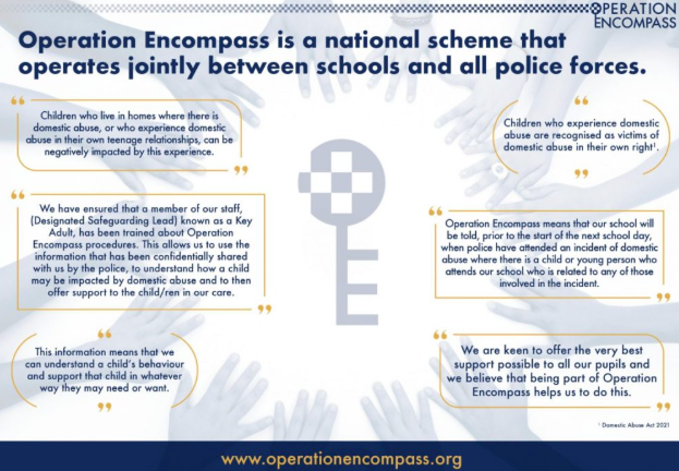 We are part of Operation Encompass, a national safeguarding initiative which supports children who may have been affected by domestic abuse.